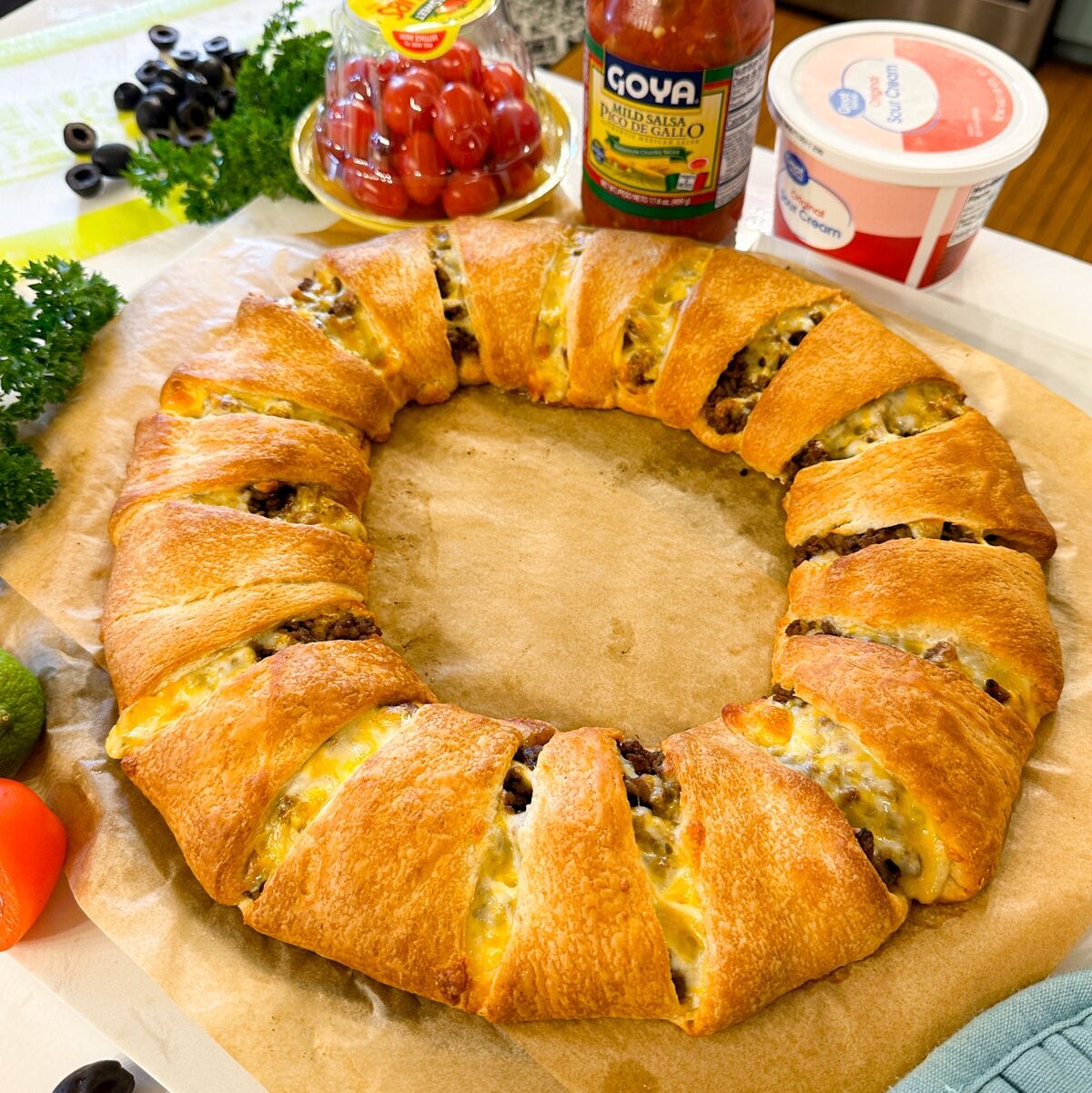 - Make Christmas Version: Make this delicious and easy taco ring any time of year but if you want a festive version, just slide the warm ring onto a Christmas platter and decorate with parsley, springs of rosemary and sliced cherry tomatoes! It’s perfect for holiday parties and get-togethers!